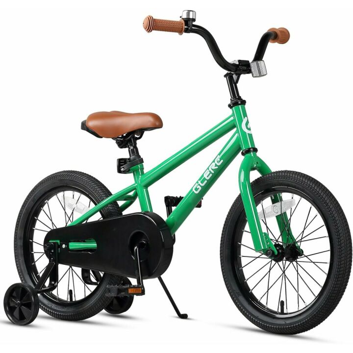 Show moreThe Glerc Pongo 16-inch Little Kids Bike is the perfect blend of vintage charm and modern functionality. Crafted specifically for boys and girls aged 4 to 7 years, this retro-style bicycle is as stylish as it is functional. The bike comes in a classic green color, which adds to its timeless appeal. It is designed with high-quality materials making it both durable and lightweight, ensuring that even the youngest of riders can handle it with ease. Additionally, the bike comes equipped with training wheels to provide extra stability for beginners, and a bell ring to make rides more fun and safe.