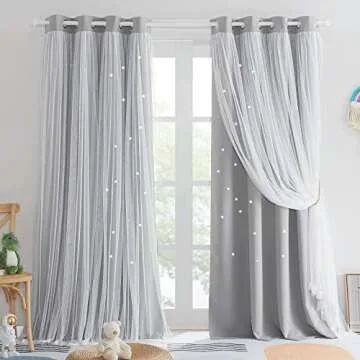 PONY DANCE Blackout Curtains for Nursery - Stars Cutout Decor for Bedroom Aesthetic Window Treatment Double Layer Drapes Sheer Overlay, W 52 x L 84 Inches, Silver Grey, 2 Panels