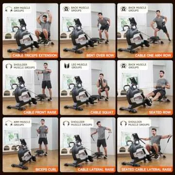 Show moreThe Pooboo Magnetic Rowing Machine is not just any rowing machine; it's a revolutionary fitness solution designed to transform your home workout experience. Combining aerobic and anaerobic exercises, this unique piece of equipment offers you the benefits of a traditional rower while also providing the versatility of a strength training machine. With a patented combination multifunctional trainer, it allows for a full-body workout that targets every muscle group. Use it for rowing, or switch seamlessly to strength exercises like lateral raises, bicep curls, front raises, and squats, catering to your personal fitness goals — whether that's weight loss, body shaping, or building strength.