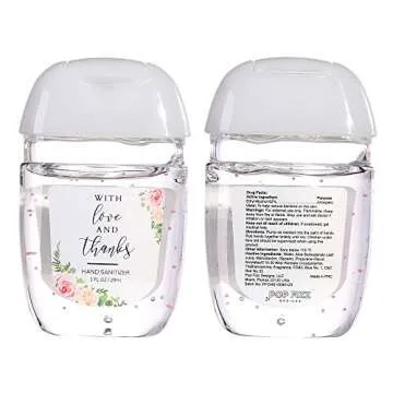 Show more Introducing the perfect combination of practicality and charm: mini hand sanitizers that embody the spirit of love, health, and happiness! Designed especially for weddings and special events, these high-quality sanitizers are just what you need to ensure your guests feel safe and clean on your big day. Imagine the smiles on their faces as they receive a stylish purse-sized hand sanitizer that not only protects their well-being but also serves as a delightful reminder of the joyful celebration. Pop it in your purse and carry it everywhere – it's the perfect accessory for today's fast-paced world.