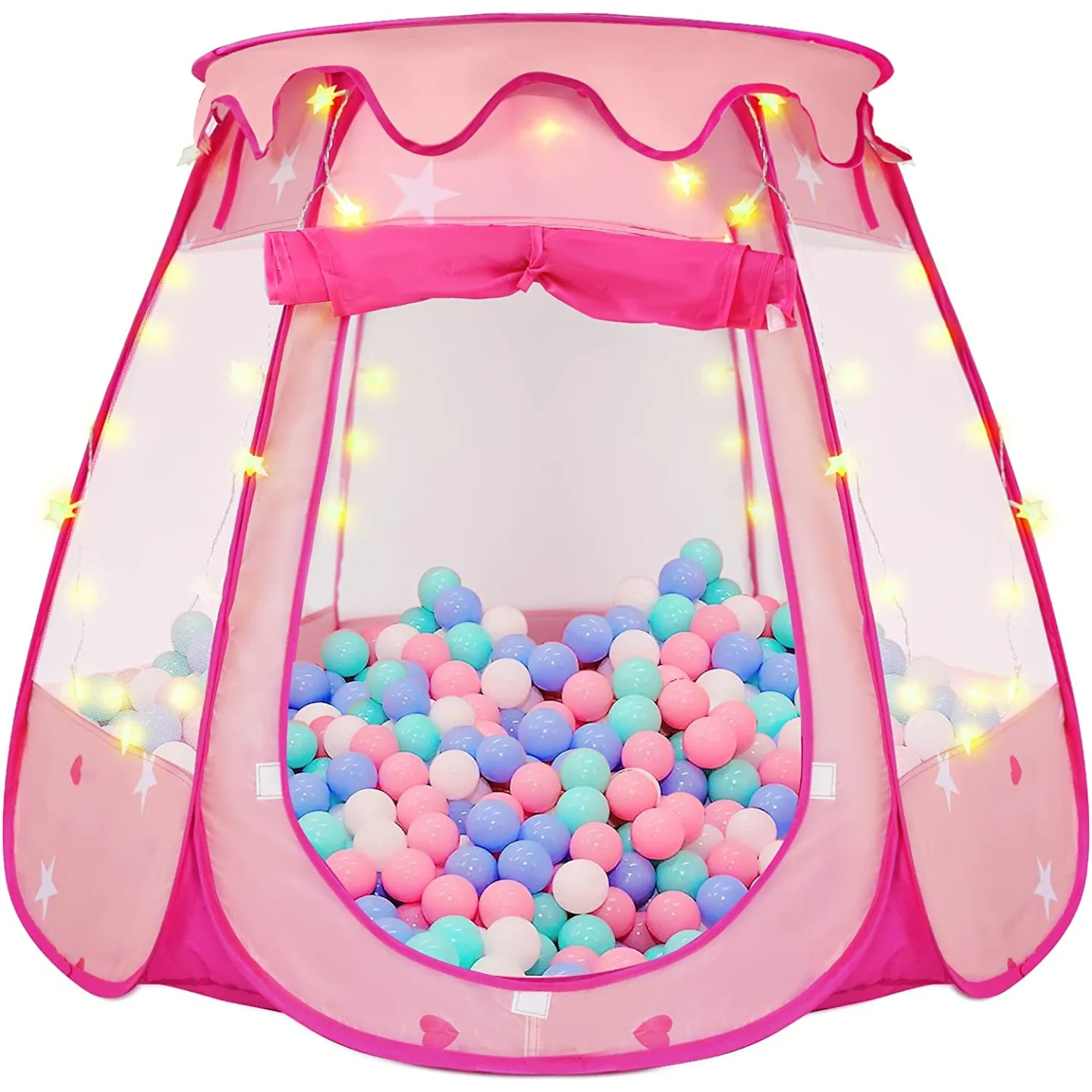 ZUOSEN kids tent has undergone rigorous production procedures and complies with all USA toy safety regulations. It is comfortable and safe to use.The kids ball pit tent, mesh windows, detachable skylights, and doors with roller shutters are all included with this girls' play tent.Princess tent turns any space into a child's fantasy playhouse, fostering their imagination, creativity, and practical skills.(Balls not included, please!100-300 ball pit balls are ideal.)Best Gift and Widely Use: This pop-up princess tent measures 13.8 x 13.8 x 1.2 inches when folded and 49 x 49 x 33 inches when unfolded.These ideal dimensions were created specifically for gifts or toys for girls who are 1, 2, 3, or older.On birthdays, Christmas, Thanksgiving, and Halloween, they make excellent gifts.Princess toys are also frequently used indoors or outdoors for gatherings, picnics, parks, playgrounds, daycares, schools, carnivals, or to create a child's fantasy fort in the playroom at home.Our princess tent for girls is made of high-quality polyester and is very easy to clean.The thicker fabric increases the tent's elasticity, durability, and resistance to wrinkles, helping to prevent soiled toys or clothes from getting inside.Kids play tent is also simple to clean; all you need to do is wipe it down with a damp cloth to make it look brand new.The breathable mesh on the side of this girls tent allows parents to keep an eye on their kids at all times to ensure their safety.The princess tent is ready to use as soon as you open this girl's toy; it requires no assembly and is simple to store.The assembly issues can be easily resolved with this pop-up design.