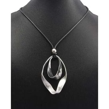 Popeoiuh Leather Necklace for Wome Silver Double Circles Alloy Pendant Leather Necklaces with Long Adjustable Genuine Leather Rope Choker Jewelry