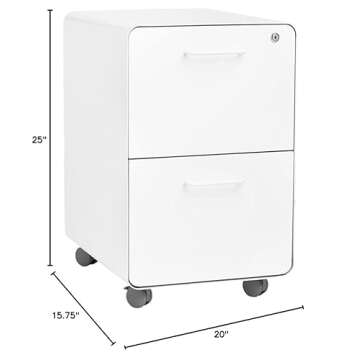 Poppin Stow 2-Drawer File Cabinet - White. Powder-Coated Steel. Legal/Letter Sized Drawers. Two Locking and Two Non-Locking Wheels. Two Keys Included. 1 Lock for Both Drawers