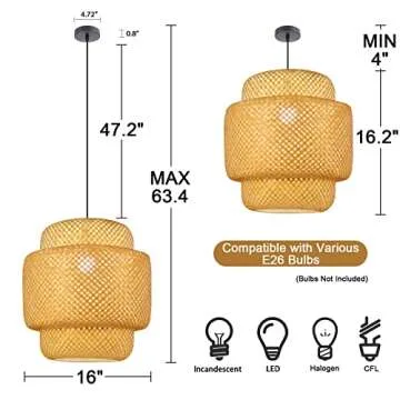 Show more Introducing the POPRHINO Rattan Pendant Light Fixture, an exquisite addition to your home that seamlessly blends natural aesthetics with contemporary design. Handcrafted by skilled artisans using sustainable bamboo and rattan materials, this pendant light stands out with its enchanting bohemian charm. Decorative elements, such as curved bamboo curtains and rustic wooden canopies, evoke a cozy tropical vibe that infuses warmth into any room, be it a dining area, reading nook, or restaurant. With a well-thought-out design and functionality, this pendant light measures a generous 16” x 16.2” and includes a durable, adjustable black cable, making it perfect for both low and high ceilings, allowing you to create the desired ambiance effortlessly.