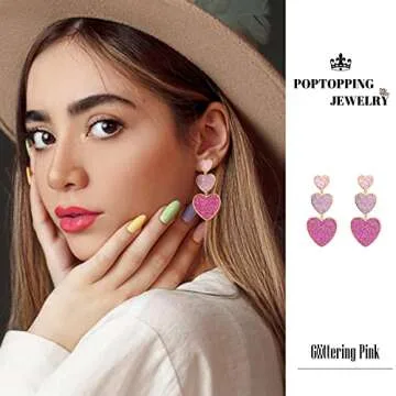 Show more Step into the limelight with our PopTopping Gold and Pink Long Heart Dangle Earrings, designed for the modern woman who loves to express herself through exquisite jewelry. These beautiful earrings feature an enchanting combination of charming pink hearts, bordered in gleaming gold, making them the perfect fashion statement for any occasion. Crafted with hypoallergenic piercing posts, they are comfortable to wear, even for extended periods. The graduated heart sizes not only add a unique flair but also create a visually stunning cascade that will catch the light (and everyone’s attention) seamlessly.