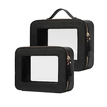Show moreIntroducing the Popvibe Clear Makeup Case Set, your new best friend for organization on-the-go! This stylish two-piece set comes equipped with a medium bag measuring 8.3'' x 6.1'' x 2.4'' and a larger option that spans 9.6'' x 7.5'' x 3.1''. Made from top-quality saffiano faux leather, these bags are not only luxurious and fashionable but also built to last, showcasing a sleek, sophisticated design that makes them suitable for any occasion. Equipped with durable zippers and gold metal hardware, these bags offer a touch of elegance alongside practicality, allowing you to elevate your travel experience without breaking the bank.