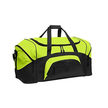 Show moreThe Port & Company Color Block Sport Zipper Duffel Bag in striking Safety Yellow and Black is more than just a bag—it's your perfect companion for any adventure. Measuring 13.5 inches high, 27.25 inches wide, and 14.5 inches deep, this duffel offers approximately 5,372 cubic inches of storage space, making it exceptionally roomy for all your essential gear, whether you’re headed to the gym, a weekend getaway, or an overnight trip. Its durable 600 denier polyester fabric ensures that the bag is tough enough to withstand daily use, while the vibrant color block design adds a stylish touch that easily stands out in a crowd.