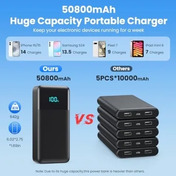 Show more Introducing the ultimate solution for all your charging needs, the Portable Charger 50800mAh Power Bank. Designed for speed and convenience, this powerhouse charger is a must-have for tech-savvy users who lead busy lives. With a whopping 50800mAh capacity, it can easily keep your devices charged for days, making it perfect for travel, emergencies, or everyday use. Equipped with three built-in cables (Type-C, iOS, and Micro USB), you’ll never have to fumble for that extra charging cord again. Enjoy the efficiency of rerouted energy with the high-performance 25W PD and QC4.0 fast charging technology, which refuels your devices at lightning speed — up to three times faster than conventional chargers. The LCD display shows real-time battery levels so you’ll always know where you stand. This power bank seamlessly combines practicality with impressive performance for the modern user.
