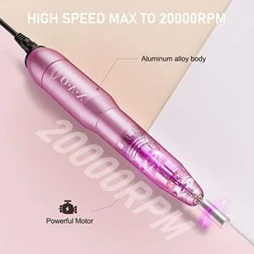 Crafted with a high-quality aluminum alloy body, this electric nail drill features a powerful motor that operates with minimal noise and vibration, ensuring a comfortable experience during use. With an adjustable speed of up to 20,000 RPM, you can customize your nail care, whether you're doing a quick touch-up or an intricate design.