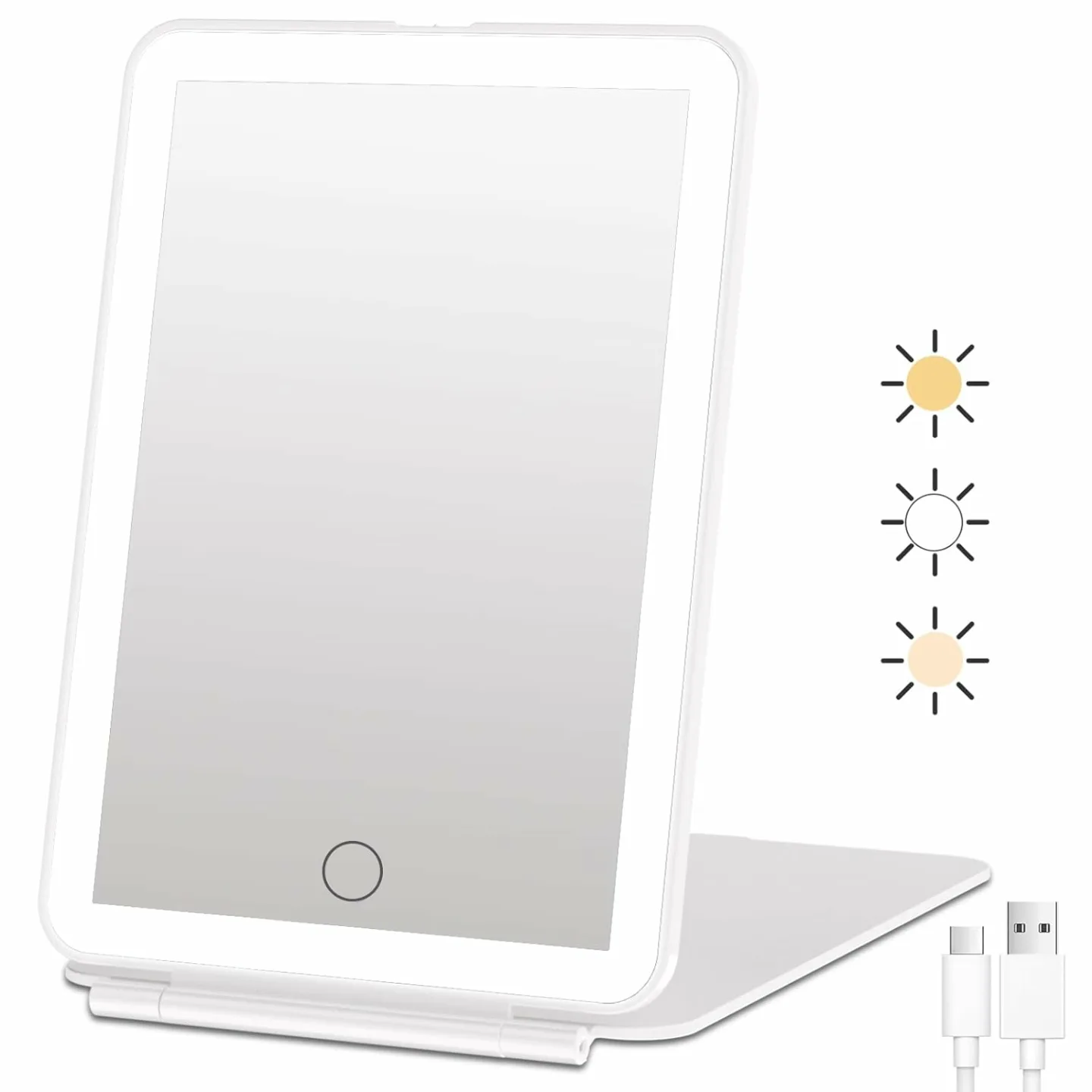 The FUNTOUCH mirror stands out with its 72 LED lights, ensuring superior illumination. Its 3 color lighting modes and dimmable touch screen allow for customized lighting settings. The mirror's foldable design and sturdy stand add to its practicality and ease of use. Unlike many travel mirrors, it comes with a rechargeable battery and a charger, ensuring you're always prepared, even on extended trips.