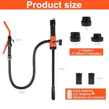 Crafted with quality in mind, this pump's upgraded design features a flexible, bendable intake hose that reaches the very bottom of fuel tanks or containers, ensuring no residue is left behind. Complete with three different adapters, it fits a wide range of container sizes, from standard barrels to jerry cans, making it perfectly versatile. The pump operates efficiently with either 2 D cell or 6 AA batteries (not included), providing a truly portable solution to your liquid transfer needs.