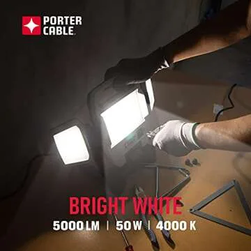 PORTER-CABLE 50W 5000 Lumen LED Work Lights, Portable Three-Head Work Lights with Stand, Corded for Construction Site, Garage