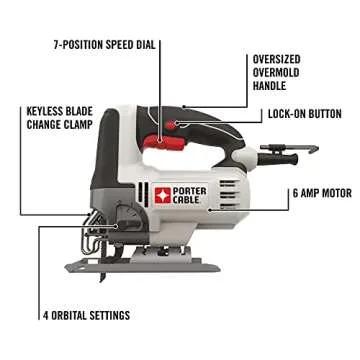 Show moreDiscover the ultimate tool for your next cutting project with the innovative jigsaw equipped with a robust 6 Amp motor, delivering exceptional power in even the most demanding applications. Whether you are a professional woodworker or a DIY enthusiast, this jigsaw's 7 Position Speed Dial allows for optimized cutting speeds ranging from 0 to 3200 spm, adapting perfectly to the material being cut. Its four orbital settings are designed to ensure the best cutting performance, whether you're working with wood, metal, or plastic.
