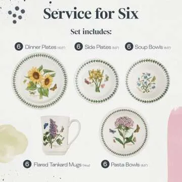 Show more Elevate your dining experience with the exquisite Portmeirion Botanic Garden 30-Piece Dinnerware Set. This beautifully crafted dinnerware set features a variety of plates, bowls, and tankard mugs, each adorned with stunning floral motifs that bring the beauty of nature to your table. Each set includes 6 dinner plates (10.5-inch), 6 side plates (6.5-inch), 6 large bowls (8.5-inch), 6 small bowls (6.5-inch), and 6 tankard mugs (14-ounce), providing everything you need for an exquisite dining experience. Made from premium earthenware, this dinnerware set is not only aesthetically pleasing but also incredibly durable, ensuring it withstands the rigors of daily use.