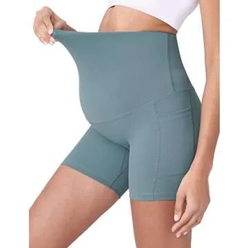 POSHDIVAH Women's Maternity Yoga Shorts Over The Belly Bump Summer Workout Running Active Short Pants with Pockets Light Green 5" Large