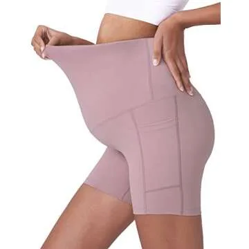 POSHDIVAH Women's Maternity Yoga Shorts Over The Belly Bump Summer Workout Running Active Short Pants with Pockets Pink 5" Medium