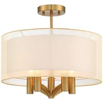 Show more Illuminate your living space with sophistication and style with the magnificent Possini Euro Design Caliari Modern Close to Ceiling Light Fixture. Perfectly crafted to enhance high-ceilinged areas, this exquisite 18-inch wide semi-flush mount light fixture features a unique double shade design that casts a warm and inviting glow in your home. The outer layer, made from sheer gold organza, delicately filters the light, while the inner white linen shade creates a soft, diffused illumination. This stunning combination not only enhances the light's visual appeal but also ensures an atmosphere of warmth and comfort for every occasion, making it a must-have for anyone seeking to elevate their interior design.