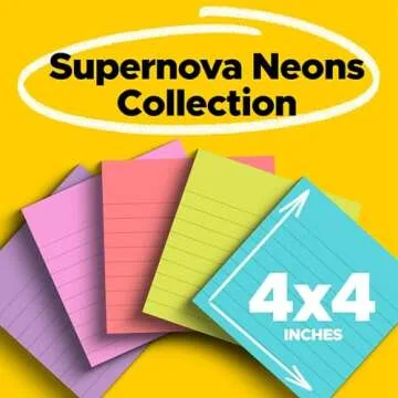 Stay organized like never before with Post-it Super Sticky Lined Notes. Each pack contains 6 pads of vibrant 4 in. x 4 in. lined notes, offering a total of 540 sheets to keep your thoughts, tasks, and ideas at your fingertips! Perfectly designed for your office, classroom, or work area, these sticky notes provide a versatile solution for all your note-taking needs. With the added charm of the Supernova Neons Collection, featuring...