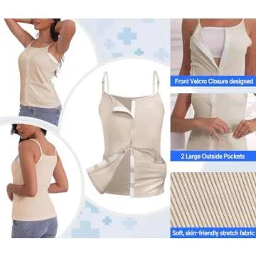 Post Mastectomy Shirts with Drain Pockets Breast Surgery Mastectomy Camisole Top with Hook and Loop Closure Beige XL
