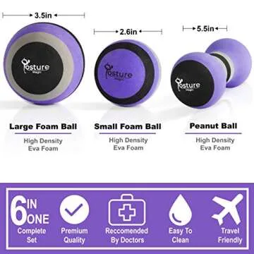 Show more Introducing the ultimate self-care solution, the Posture Magic 6-Piece Massage Ball Set! Designed with precision and care, this all-inclusive kit is perfect for anyone seeking a deep tissue massage experience from the comfort of their home or on the go. Each element in this set plays an essential role in rejuvenating your muscles and relieving tightness, making it a staple for every fitness enthusiast and wellness seeker. The bundle features a large foam ball (3.5”), a small foam ball (2.6”), a smooth lacrosse ball (2.5”), a peanut ball (5.5”), a spiky ball (3”), and a hand exercise ball (2.6”), all conveniently packaged in a durable carry bag.