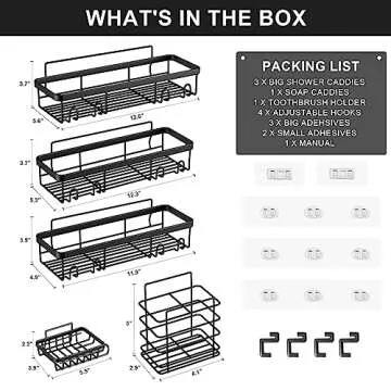 Show moreTransform your shower space with the Posyla Shower Caddy, a versatile and efficient storage solution designed to keep your bathroom essentials organized and within reach. This comprehensive set includes three spacious shower racks, a practical soap shelf, a toothbrush holder, and four adjustable hooks for hanging loofahs and more, totaling five pieces to cater to all your restroom needs. Crafted from premium stainless steel, these organizers are not only waterproof and corrosion-resistant but also boast a sleek black finish that complements any bathroom décor. Say goodbye to clutter and hello to an elegant, tidy shower experience with this expertly designed caddy.