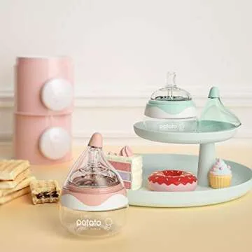 POTATO Glass Baby Bottles for Newborn Babies, Anti Colic Breastfeeding Bottle with Wide Neck, Slow Flow, 2pack, 2.5oz, Pink