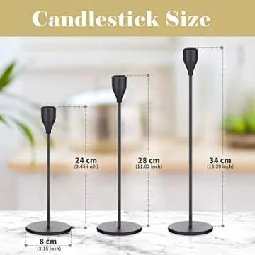 This set includes three candle holders in assorted heights: 34 cm (13.4 inch), 28 cm (11 inch), and 24 cm (9.5 inch), making them suitable for standard 3/4 inch taper candles or battery-operated versions. This versatility allows for endless decorating possibilities, whether for your dining table, fireplace mantle, or shelf.