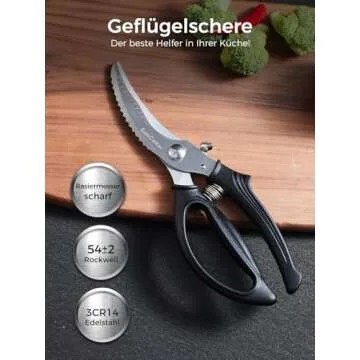 Show more Introducing the SimCoker Heavy Duty Poultry Shears, a must-have for every home chef or professional kitchen. Made from durable 3CR14 stainless steel, these shears are designed for a lifetime of use and are tougher and more resistant to corrosion than standard kitchen scissors. With a thickness of 3.5 mm, the blades are not just sharp but built for high performance, allowing you to slice through everything from vegetables to meats effortlessly.