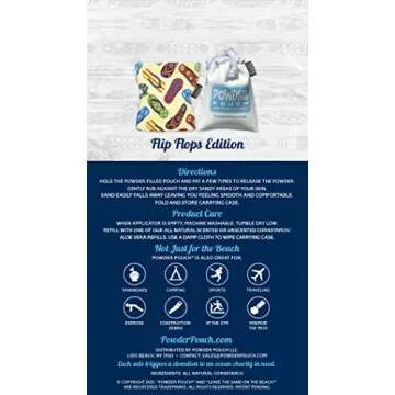 Show moreIntroducing the ultimate beach essential, the Powder Pouch® Sand Remover - Flip Flops Edition! This innovative product revolutionizes how you deal with sand after a fun-filled day at the beach. Designed with meticulous attention to detail, this beach accessory offers effortless sand removal, allowing you and your family to enjoy more time splashing in the waves and less time cleaning up. The Powder Pouch is not only refillable and reusable but also washable, ensuring high hygiene standards while contributing to environmental conservation by minimizing waste. Made from 100% All Natural Cornstarch, it is completely talc-free, making it perfect for those with sensitive skin.
