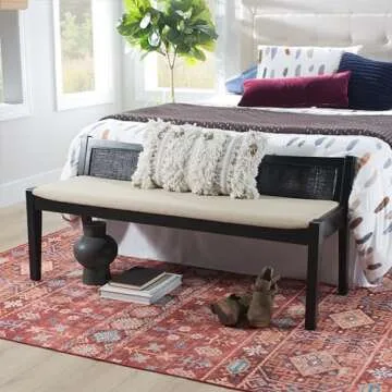 Show moreIntroducing the **Powell Kasi Black Low Back Cane Bench**—a perfect blend of style and functionality that will enhance any space in your home. Crafted with a solid wood frame and legs, this bench assures **durability** and **sturdy support**, accommodating up to **275 lbs**. The cushioned seat is upholstered in a **beige linen look fabric**, providing a wonderfully comfortable perch for your guests or family members. Its stylish black finish combined with the elegant woven rattan back adds a touch of sophistication to your decor, making it a stunning focal point in any room.