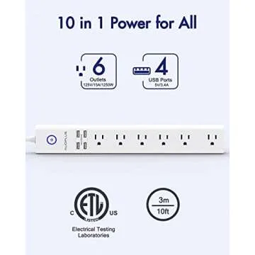Show more Introducing the AUOPLUS Power Strip Surge Protector, your ultimate charging solution that combines functionality with innovation. This power strip is equipped with six surge protector outlets, including five standard and one extra wide spaced outlet, offering practicality that far surpasses the typical narrow socket panels. Its impressive 10 ft. heavy-duty extension cord ensures that you can easily reach your devices across any space, making it the perfect companion for both home and office settings.