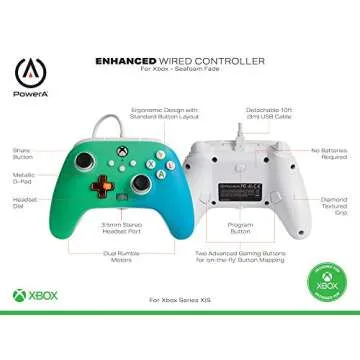 Show moreExperience next-level gaming with the PowerA Enhanced Wired Controller for Xbox Series X|S - Seafoam Fade. This ergonomic gamepad is designed for comfort and precision, making it a perfect choice for both casual and hardcore gamers. Featuring a standard button layout including a new share button for easy media sharing, the controller is equipped with dual rumble motors that enhance gameplay immersion by providing tactile feedback. The diamond-texture grip ensures a secure hold during lengthy gaming sessions, while the metallic d-pad offers a sleek look and improved responsiveness.