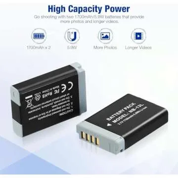 Show more Introducing a cutting-edge battery solution designed for photography enthusiasts: the NB-13L Replacement Battery and Dual Rapid Charger set. This product stands out with its powerful 1700mAh capacity, allowing for an extended runtime that significantly increases your shooting opportunities. Unlike smaller batteries that limit the number of shots, our enhanced battery ensures that you can capture every precious moment without worrying about running out of power.