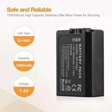Show more Introducing the Powerextra Replacement Sony NP-FW50 battery, the ultimate companion for all photography enthusiasts! This versatile battery is not only compatible with a wide range of Sony cameras like the ZV-E10, Alpha A6000, A6300, A6400, A6500, A5000, A5100, and more, but it also ensures that you never miss capturing the perfect shot. Boasting a powerful battery capacity of 7.4V and 1500mAh, this lithium-ion battery guarantees longer usage time without any memory effect, allowing you to focus more on your creativity rather than worrying about battery life.