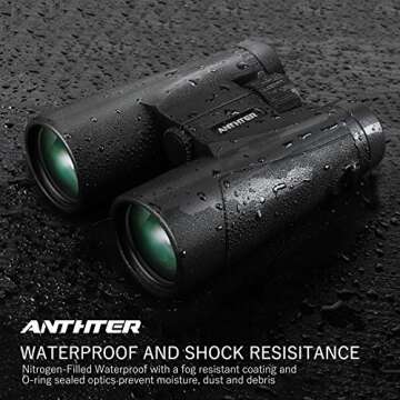 - Waterproof and Fog Proof: Designed for rugged outdoor conditions, these IPX7 nitrogen-filled binoculars are both waterproof and fog resistant, ensuring durability and performance. An O-ring sealed optics keeps out moisture, dust, and debris.