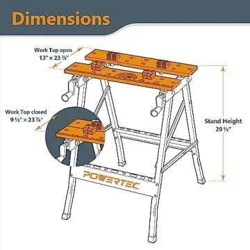 Show more Introducing the POWERTEC Portable Small Workbench with Vise—the ultimate companion for woodworking enthusiasts and professionals alike. Engineered with a heavy-duty steel frame and an elegant bamboo tabletop, this multifunctional workbench not only transforms the way you tackle your projects but also ensures durability and stability. Weighing a mere 11 pounds, it is designed for ultimate portability, allowing you to easily transport your workbench to any job site or workshop. Whether you are clamping, cutting, painting, or using it as a sawhorse, this portable workbench adapts to your needs with ease.