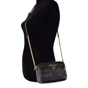 Show moreIntroducing the luxurious Prada Bandoliera Nero Black Nappa Gaufre'1 Quilted Leather Handbag (Model: 1BH112), a chic crossbody bag that effortlessly enhances any outfit. Crafted from premium rouched calf leather, this exquisite handbag showcases exquisite detailing that elevates your style from day to night. The rich black hue paired with gold-tone hardware radiates elegance, making it a must-have accessory for fashion-forward individuals. With a convenient detachable chain and leather crossbody strap, this bag offers versatility, allowing you to wear it as a classic handbag or a trendy crossbody. An interior slip pocket provides practical storage solutions while maintaining a sleek aesthetic. Measuring 7.5" x 3" x 5" (L x W x H) with a strap drop of 22", it's compact yet functional, fitting all your essentials perfectly. Displaying the iconic Prada raised logo on the front, this handbag embodies luxury and sophistication, complemented by its zip top closure that ensures the security of your items.