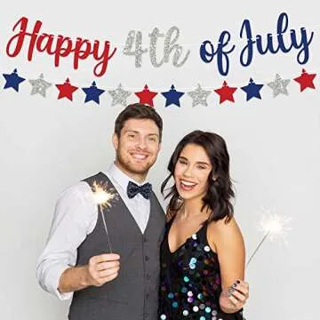 Pre-strung Happy 4th of July Banner - No DIY - Red & Blue with Silver Glitter Fourth of July Banner - Pre-strung Garland on 8 ft Strands - Independence Day Party Decorations & Decor - No DIY