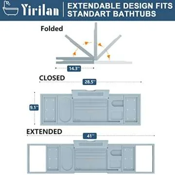 Show moreTransform your bathing routine into a sanctuary of relaxation with the Premium Bathtub Tray Caddy. Crafted from high-quality bamboo, this luxury spa essential features a beautifully designed structure that caters to all your bath-time needs. Adjusting seamlessly from 29.5 to 43 inches, this expandable tray fits almost any bathtub, making it the perfect companion for relaxation without the worry of instability. The tray is not just functional but also elegant, boasting an array of features including a dedicated phone and tablet holder, a wine glass slot, two removable spa trays for snacks or toiletries, and a free soap dish, allowing you to indulge in your favorite activities while enjoying a sophisticated atmosphere.