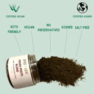 Show moreIntroducing the Premium Vegan Pesto Blend by Spice + Leaf, a game-changer for your culinary adventures! This all-natural spice blend is crafted from the freshest ingredients, combining the rich flavors of Basil, Garlic, Olive Oil, Almonds, Pine Nuts, and Sunflower Oil. Enjoy the vibrant taste of pesto without any dairy or preservatives. Ideal for those seeking a healthy alternative, our blend allows you to customize your dish with salt and your favorite Parmesan substitute. With no artificial additives, it's the pure essence of traditional pesto that you can indulge in guilt-free.