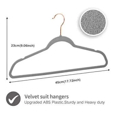 Show more Introducing the Premium Velvet Hangers, the ultimate solution for keeping your wardrobe organized and your clothes beautifully displayed. These hangers feature a stunning gray and rose gold design that not only adds a touch of elegance to your closet but also ensures that your garments remain in pristine condition. Crafted with high-quality velvet, these non-slip hangers prevent your clothes from slipping off, making them perfect for delicate fabrics and heavy winter coats alike. With swivel hooks for easy access and a space-saving design, you can maximize your closet space without compromising on style. Each pack includes 50 hangers, providing a practical yet stylish solution for all your hanging needs.