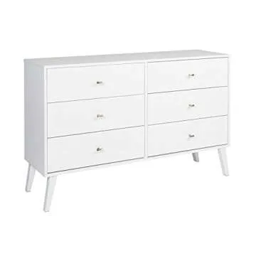 Prepac Milo Mid-Century 6 Drawer Double Dresser for Bedroom, 16" D x 52.50" W x 33" H, White & Milo Mid-Century Modern 2 Drawer Nightstand with Open Shelf, 16" D x 22.5" W x 29.5" H, White