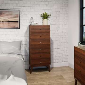 Show more Introducing the Prepac Milo Mid-Century Modern 6 Drawer Dresser, a stunning fusion of retro style and practicality that brings a charming touch to any room. This tall and narrow chest of drawers features six generous drawers, perfectly designed for those looking to optimize their storage space without compromising on style. With its elegant Cherry wood laminate finish, this dresser mimics a clean mid-century aesthetic, allowing you to enhance your decor effortlessly. The solid wooden legs with an 8-inch taper and stylish brass-finished knobs add a touch of sophistication and durability, making it an essential piece for your modern home.