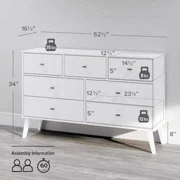 Prepac Milo Mid-Century Modern 7 Drawer Double Dresser for Bedroom, Wide Chest of Drawers, Contemporary Bedroom Furniture, 16" D x 52.5" W x 33.75" H, White, WDBR-1407-1