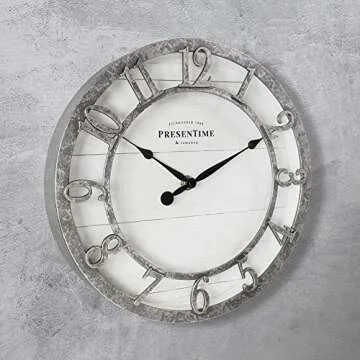 Show more This exquisite 10-inch wall clock from PresenTime & Co is the ideal fusion of style and functionality. With its distinctive farmhouse style, this clock features a specially sprayed and hand-painted galvanized finish that complements any contemporary or rustic décor. The clock face design boasts a fashionable shiplap aesthetic enhanced by 3D Arabic numerals, making time-telling both intuitive and stylish.