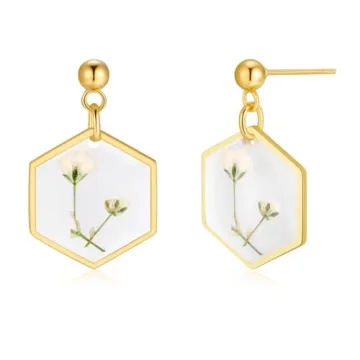 The earrings are made from 14K gold plated brass, with a beautiful baby's breath flower encased in resin and stainless steel studs.