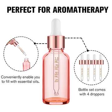 Show moreIntroducing the PrettyCare 4 Pack 1oz Eye Dropper Bottle set, the perfect companion for DIY enthusiasts and essential oil lovers! This exquisite set includes four stunning rose-colored Boston round glass bottles, each with a generous capacity of 30ml (1oz). Designed not just for beauty but functionality, the eye droppers measure 3.1 inches long, making them longer than typical droppers available on the market, ensuring you can access every drop of your favorite oils. Each dropper is equipped with a uniquely crafted scale mark, allowing for precise measurement every time.