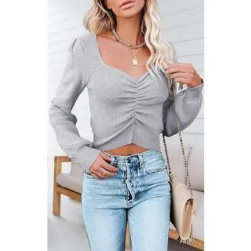 PRETTYGARDEN Fall Long Sleeve Cropped Sweaters for Women 2024 Off The Shoulder V Neck Ruched Ribbed Knit Going Out Tops (Grey, Medium)