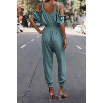 Show more Introducing the **PRETTYGARDEN Jumpsuit for Women**—the ultimate blend of style, comfort, and versatility! This stunning **Cold Shoulder One Piece Outfit** showcases a wrap V neck design that beautifully frames your neckline while allowing you to express your personal style effortlessly. Made from lightweight, breathable, and soft fabric, this jumpsuit ensures you feel as good as you look, whether it's a casual day out or a special occasion. The smocked waist accentuates your figure, providing a flattering silhouette that suits various body types.
