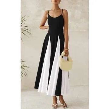 PRETTYGARDEN Sleeveless Prom Dresses 2025 Flowy Spaghetti Strap Maxi Dress Wedding Guest Dresses for Women Spring Dress (Black White, X-Large)